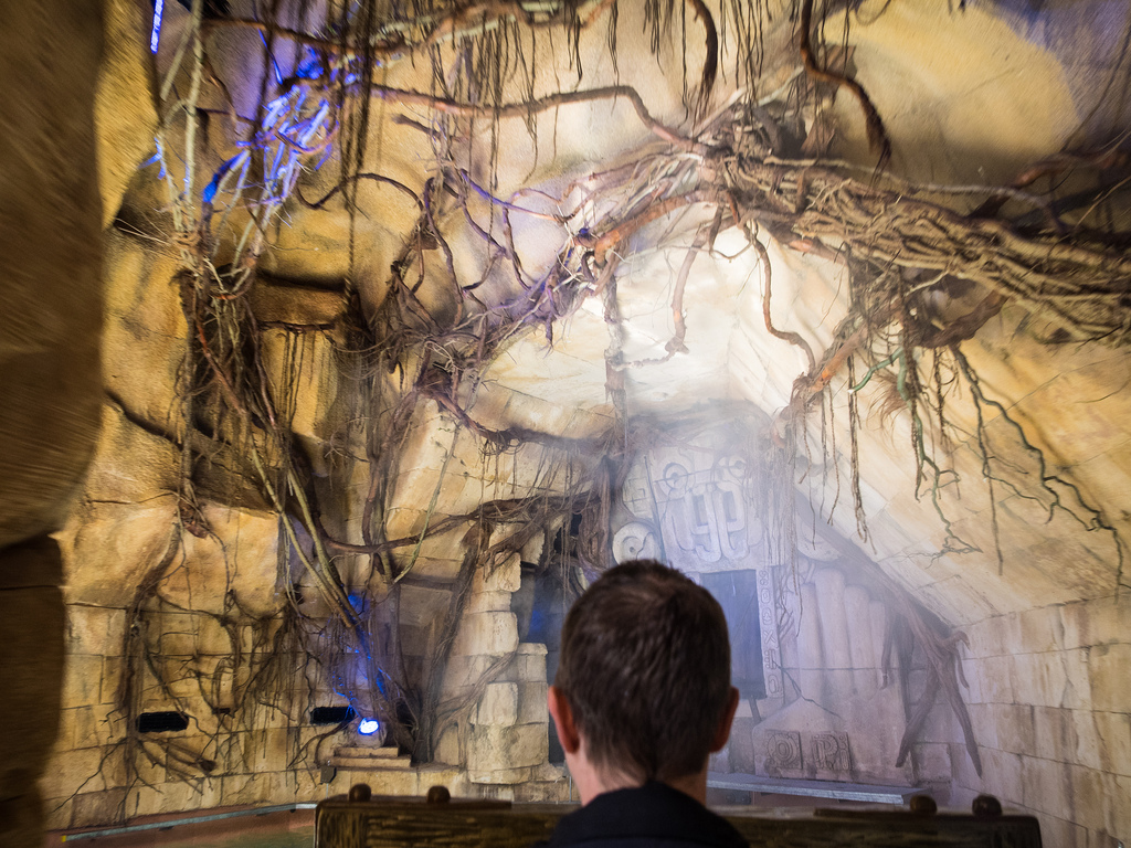 De la scénographie de la zone au parcours de l’attraction en passant par la file d’attente, les décors sont très soignés, même si – crevons l’abcès – ce n’est pas non plus du niveau de Disney. Petit regret dans la file d’attente ou le plafond n’a pas reçu de thématisation, laissant apparaître de nombreux éléments techniques et néons de service bien vilains. C’est dommage, ce type d’oubli casse instantanément tout ce que le reste des décors peuvent créer en termes d’immersion. Pour le reste, c’est impeccable. Surchargé bien-sûr puisqu’on est à Phantasialand, mais remarquable tout de même. D’ailleurs, les nombreux points de vue astucieusement placés tout autour du lac et de la chute finale sont un vrai régal auquel plus de parcs devraient penser.