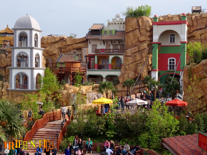 To build Chiapas, Phantasialand therefore demolished the old (double) flume ride Wildwasserbahn complete with fiberglass rocks and turquoise blue channels. The layout was very classic and did not match anymore with the new generation of attractions that made the park famous. Indeed, for more than a decade, most new rides in Phantasialand feature original technical twists. Here, it’s not just an attraction that replaces another one: an entire area of the park has received a massive makeover. In fact, this area has been changed so much that you wouldn’t even recognize the location nor the orientation, it’s pretty surprising: rocky cliffs, lake, walkways, greenery, waterfalls, restaurants, boutiques… all in a Mexican theme. I know: we’ve seen (mostly crappy) Mexican-style areas way too much in amusement parks, but for once, it’s pretty nicely done so I won’t complain.