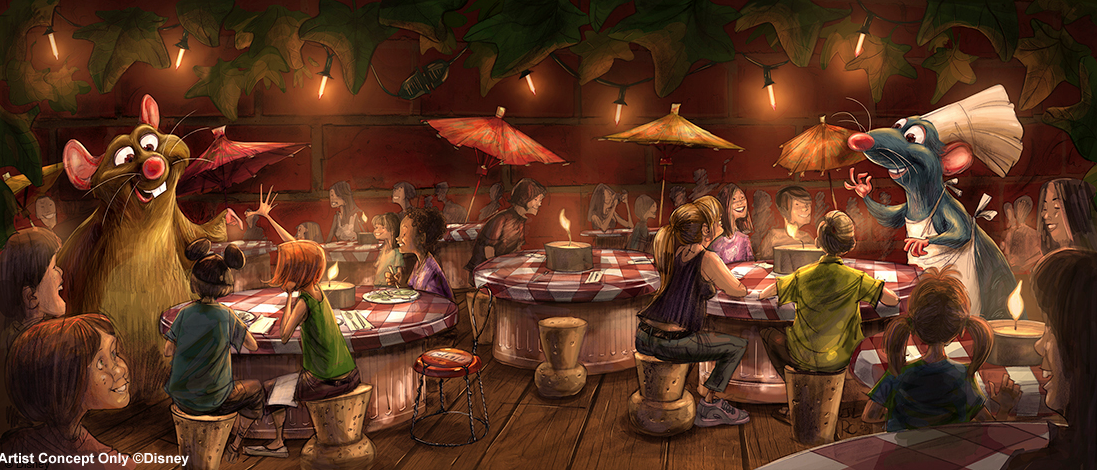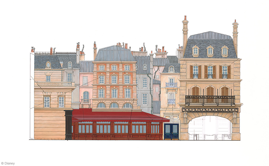 Let’s start with what most people care about: the attraction. “Ratatouille – The Adventure” is a family oriented dark-ride that promises to reduce the visitors to the size of a rat. A typically Parisian Haussmann-style building welcomes the visitors through a large entrance that is reminiscent of an old theater. Right above, the ugly initial logo of the attraction has been changed very recently for a much more beautiful one. “We just did not like the logo initially planned.” says Beth Clapperton, Walt Disney Imagineering Art Director on the Ratatouille project. Of course we agree!