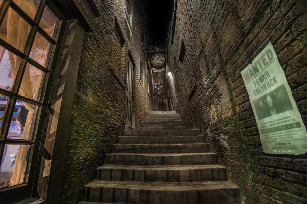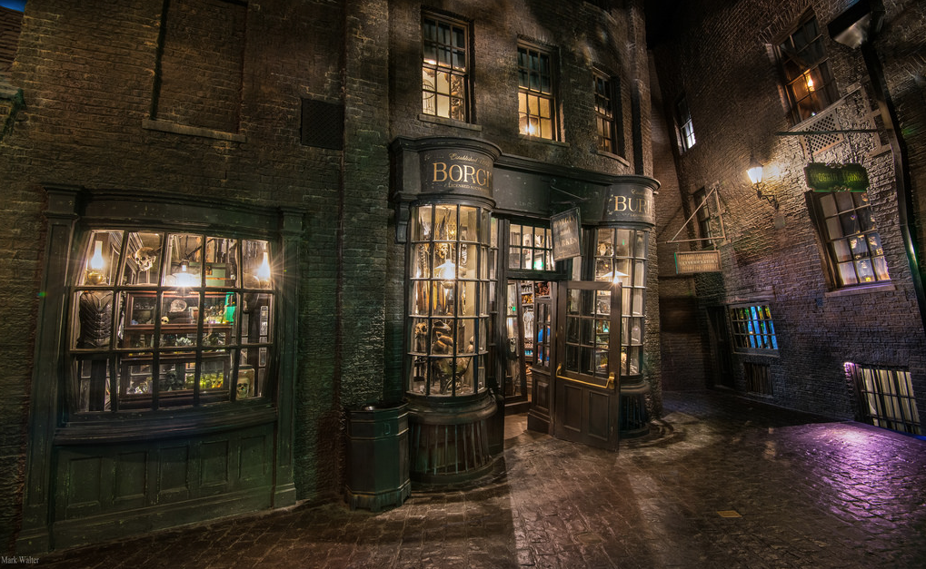 Diagon Alley regorge de recoins à explorer : vitrines, impasses et évidemment Knockturn Alley, un passage couvert où il fait nuit toute la journée (comme au Parc Astérix vous dites? Euh, oui mais non), repère des adeptes de la magie noire. Il faut aussi mentionner ce jeu interactif dans lequel vous invoquez des animations dans les rues et vitrines de Diagon Alley à l’aide de votre baguette magique (à 40 dollar, ça c’est moins fun). En outre, Diagon Alley et ses attractions explorent toute la face sombre de la saga Harry Potter : la magie noire, les mangemort, et celui-dont-on-ne-doit-pas-prononcer-le-nom. Cet aspect renforce la différenciation entre les deux Wizarding Worlds et rend ce nouveau land un peu plus adulte que le premier.