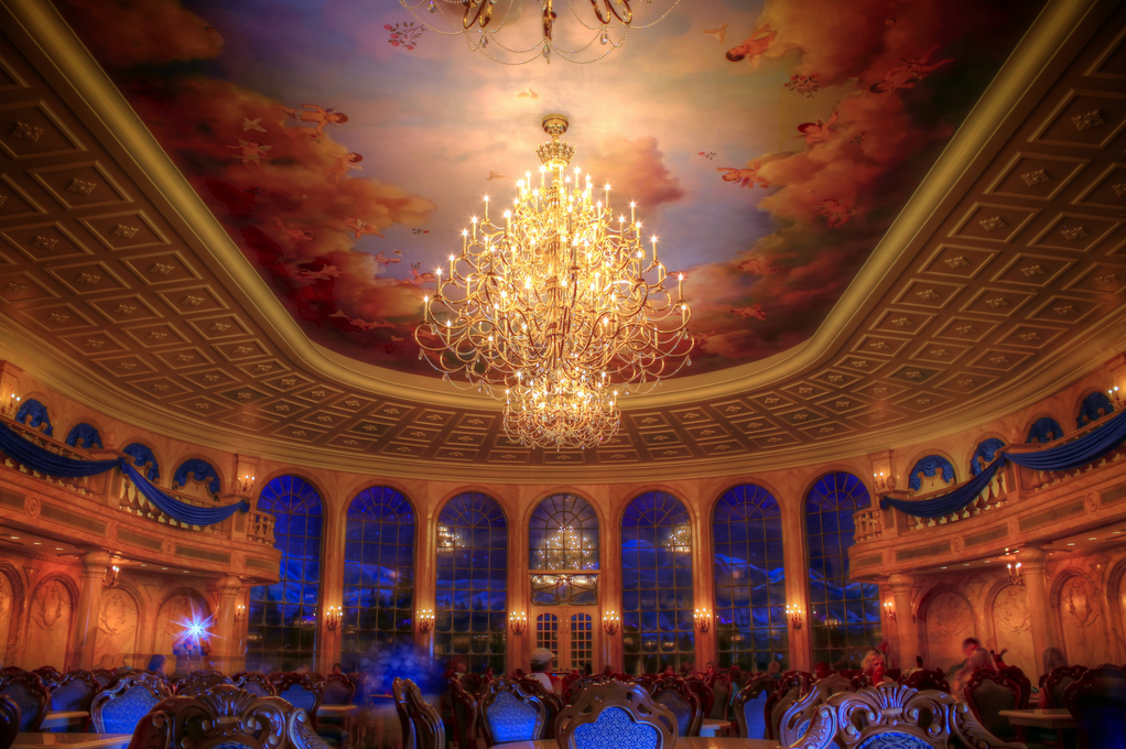Quitte à passer un meet’n’greet en revue, pourquoi pas un restaurant me direz-vous. Be Our Guest est un restaurant service rapide à midi et service à table le soir. Une fois traversé un grand pont surplombant la forêt, vous entrez dans le château de la Bête. Vous êtes accueilli tel un monarque et l’on vous installe à table dans l’une des trois grandes pièces du château : la salle de bal, la salle à manger et la bibliothèque de la Bête. Clairement les trois salles ne se valent pas : la salle de bal est si grande qu’on dirait un réfectoire d’école; la salle à manger fait gentiment le job mais la bibliothèque quant à elle est incroyablement riche en décors. Cette salle nous plonge en fait dans la bibliothèque après le passage dévastateur de la Bête : carreaux brisés, rideaux déchirés, mobilier détérioré, pénombre ainsi que quelques effets ingénieux : dans un coin trône une cloche de verre sous laquelle la fameuse rose perd doucement ses pétales. Aussi, à intervalles réguliers, une animation fait apparaître le visage de la Bête sur un portrait du prince lorsqu’il avait encore l’apparence humaine. L’atmosphère dans cette salle est intrigante et intimiste. Be Our Guest aurait gagné à recevoir la même attention au détail dans chaque pièce. La salle de bal notamment est tellement grande qu’il s’en dégage une ambiance bruyante, impersonnelle et peu agréable.