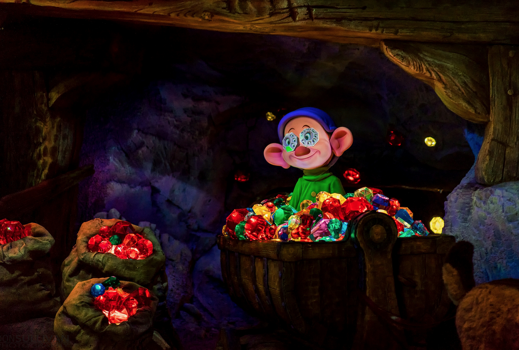 The dark-ride section takes us right into the mine of the seven dwarfs where hundreds of colored diamonds shine and glow. The audio animatronics of the seven dwarfs are remarkably smooth. The animation of the characters’ faces features internal video projection (like the Buzz Lightyear Astro Blasters queue animatronic) is excellent and mastered to perfection. Be careful, no picture or video you can find online do justice to this technique, you really have to see it live to witness the brilliant execution. This short dark-ride scene also includes a nice idea: the shadow of the seven dwarfs walk along us on the walls of the mine while the train goes up on the lift while dwarfs whistle their signature song ‘Hey-ho’. Riders can’t help but sing along wih them. A tlovely moment of immersion into the story. It should be noted how the original score from the Snow White movie fits perfectly as an attraction sondtrack: simple, catchy songs that will be stuck in your head for the rest of the day like It’s A Small World, except it doesn’t make you want to kill someone when you exit the Seven Dwarfs Mine Train.